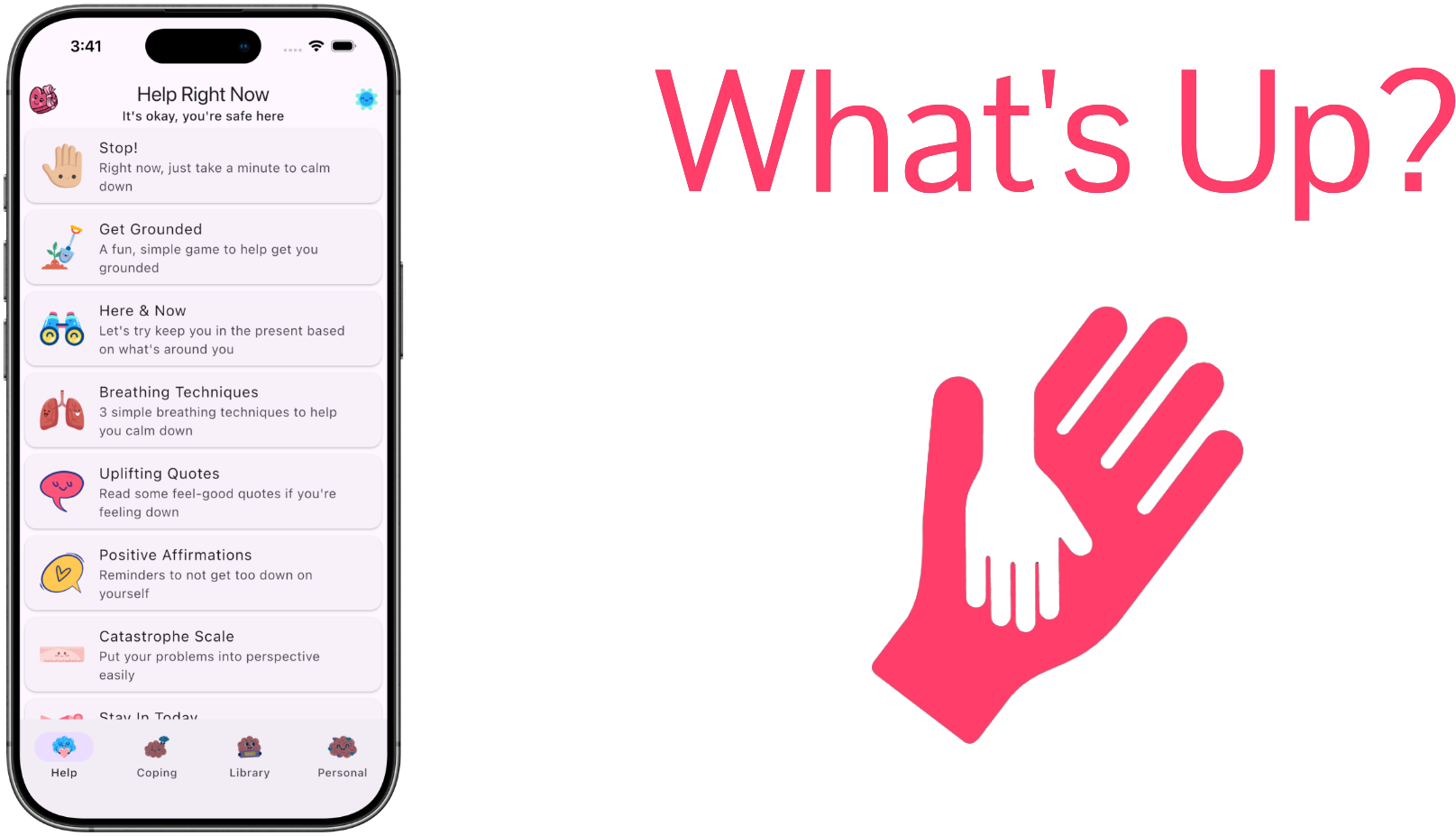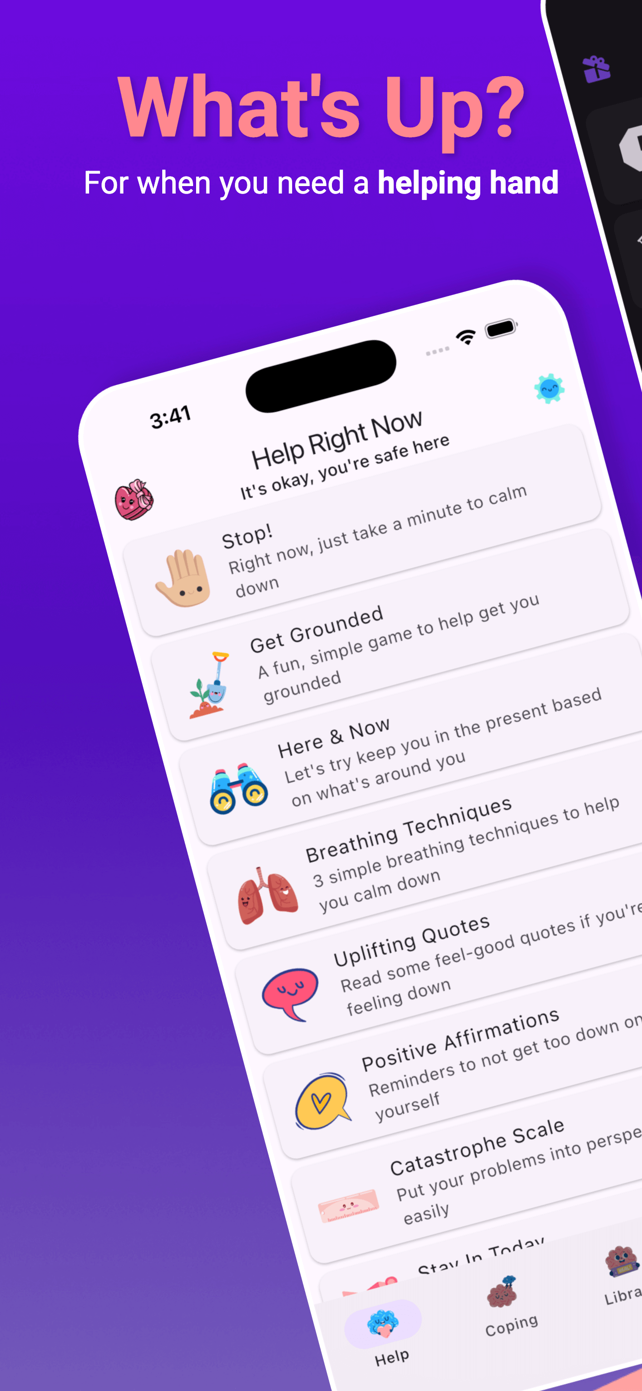 With simple coping strategies, you can get to what helps you the most in seconds. And, all major features are 100% free, with no ads!